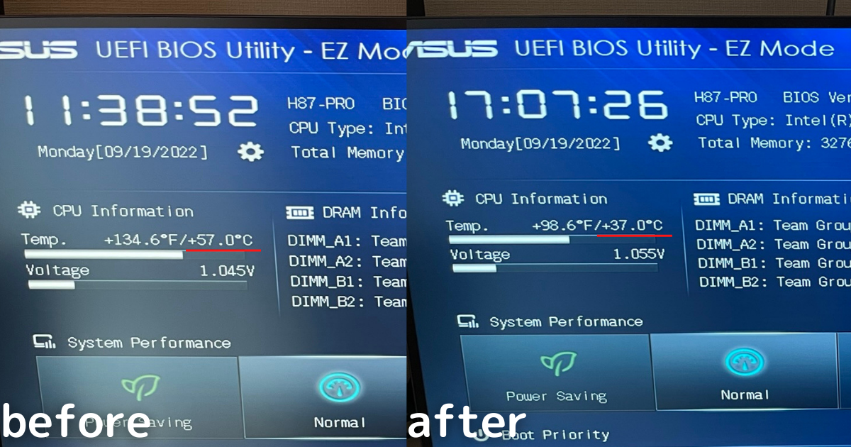 BIOS起動して数分後のCPU温度を計測したところ、57℃→37℃まで大幅に低下。