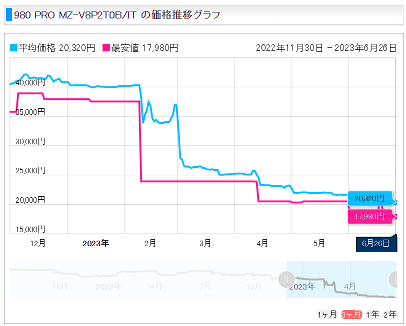 今回データ保管用SSDとして購入したSamsung SSD 980 PROの価格推移グラフなんですが、やばくないですか。